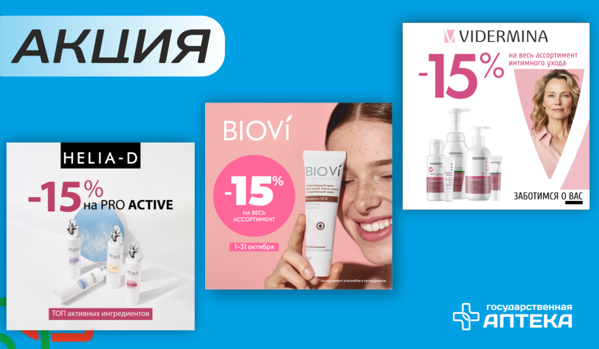 Весь октябрь скидка 15% от сформированных розничных цен на выделенный ассортимент продукции ТМ «Vidermina», «BIOVI» и «HELIA-D».