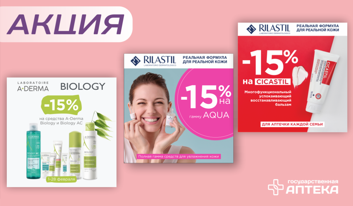 Весь февраль 2026г. скидка 15% от сформированных розничных цен на выделенный ассортимент продукции брендов «A-DERMA» и «Rilastil».
