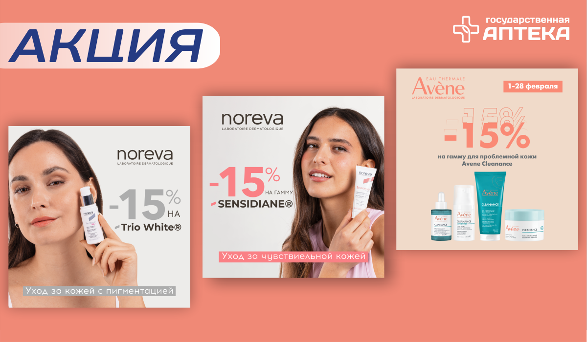 Весь февраль 2026г. скидка 15% от сформированных розничных цен на выделенный ассортимент продукции брендов «AVENE» и «Noreva».
