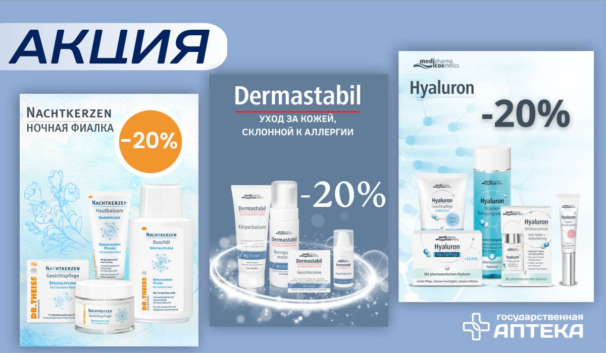 В феврале 2026г. на весь ассортимент продукции ТМ «Hyaluron», «Ночная фиалка» и «Dermastabil» действует акция с предоставлением покупателям скидки в 20% от сформированных розничных цен.