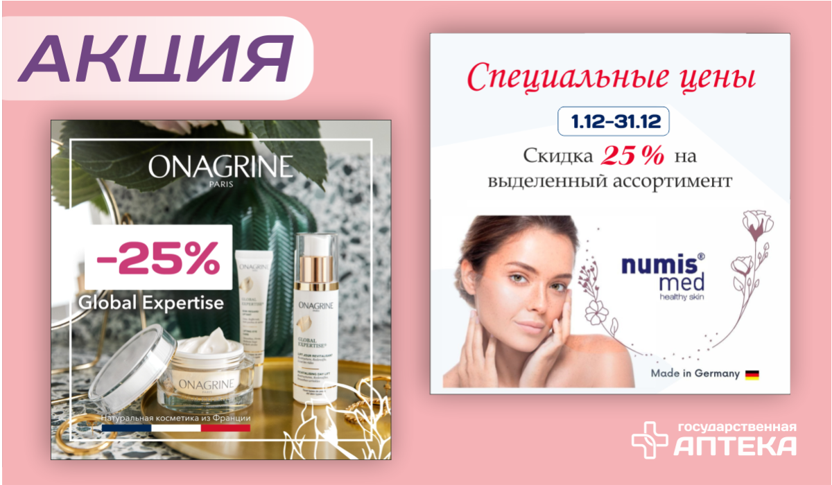 В декабре на выделенный ассортимент продукции ТМ «Numis med» (весь ассортимент, кроме шампуней) и «Onagrine» действует акция с предоставлением покупателям скидки в 25% от сформированных розничных цен.