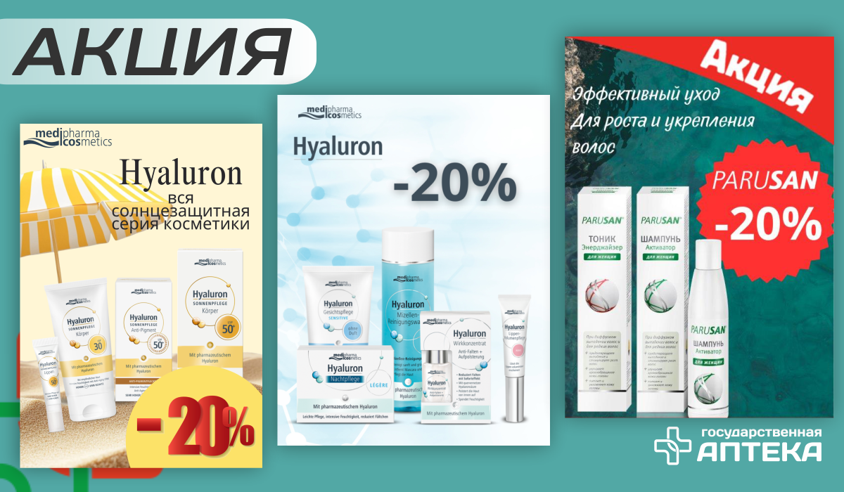 Весь ноябрь скидка 20% от сформированных розничных цен на весь ассортимент продукции брендов «Hyaluron» и «Parusan».
