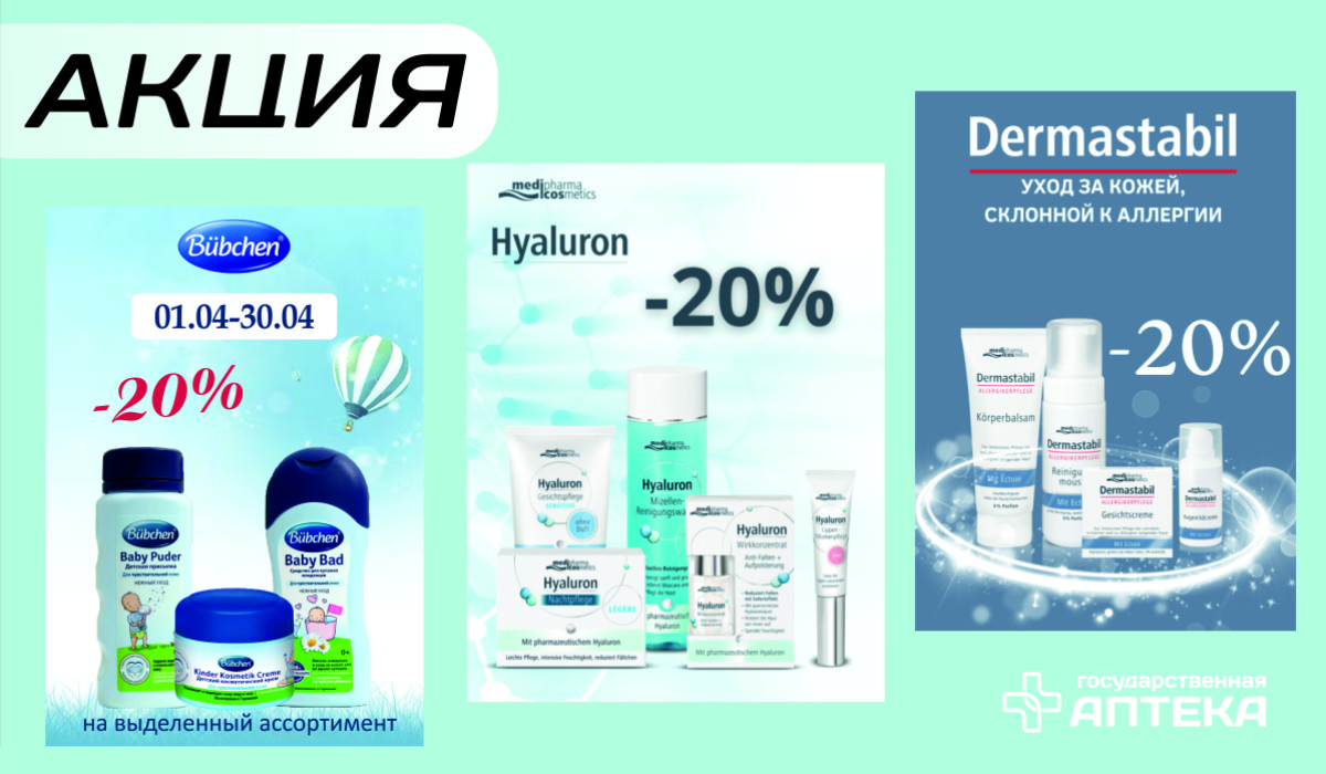 Весь апрель 2026г. скидка 20% от сформированных розничных цен на выделенный ассортимент продукции брендов «Hyaluron» (весь ассортимент), «Bubchen», «BIOVI» и «Dermastabil» (весь ассортимент), а также скидка 15% от сформированных розничных цен на выделенный ассортимент продукции бренда «Helia-D».